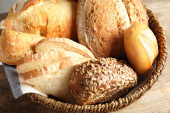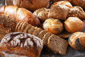 Mężczyzna trzyma drewnianą tacę z różnymi bułeczkami ciasta