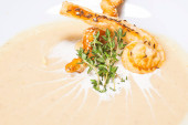Specjalny talerz wykonany przez szefa kuchni restauracji z pomidorami na białym tle