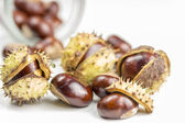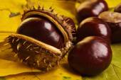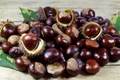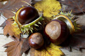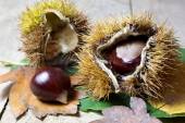 kasztany świeże z otwarte łuski na stary prosty drewniany stół z brązowy autumn odchodzi
