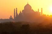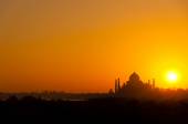 Taj Mahal odbił się w rzece Yamuna o zachodzie słońca w Agrze w Indiach. Został zamówiony w 1632 roku przez cesarza Mughala Shah Jahana, aby pomieścić grób jego ulubionej żony Mumtaz Mahal..