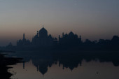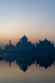 Taj Mahal odbił się w rzece Yamuna o zachodzie słońca w Agrze w Indiach. Został zamówiony w 1632 roku przez cesarza Mughala Shah Jahana, aby pomieścić grób jego ulubionej żony Mumtaz Mahal..
