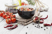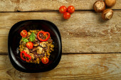 Koncepcja smacznej żywności z wołowiną z warzywami, widok z góry