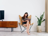 facet siedzi na białej kanapie smartfon Technologia stylu życia