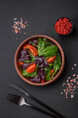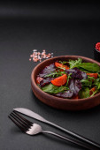 Świeże pyszne sałatki z rękawami, szpinakiem i liści buraka z oliwą z oliwek na czarnym talerzu. Smaczna zdrowa żywność