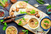 Stek mięsny ozdobiony kwiatami nasturcji. Stek wieprzowy w plasterkach, sałatka.