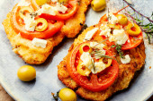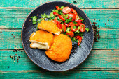 Kotlet z kurczaka z dekoracją z fasoli szparagów i marchwi. Ukraińska tradycyjna żywność