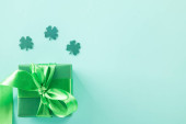 Top view photo of st patrick's day decorations green giftbox with polka dot pattern surrounded by shamrocks and clover shaped confetti on isolated yellow background with copyspace
