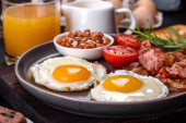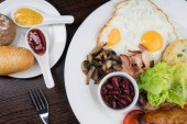 Śniadanie z jajecznicą, bekonem, kiełbasą i tostem na stole restauracyjnym