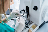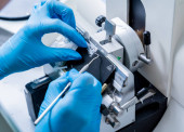 Asystent laboratoryjny pracuje nad sekcją mikrotomu obrotowego i wykonaniem szkiełek mikroskopowych