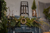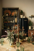 Wystrój świąteczny, pięknie urządzony salon z kominkiem i drewnem