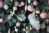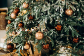 Choinka z pięknymi zabawkami, stylowe Boże Narodzenie i Nowy Rok wystrój