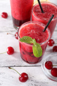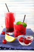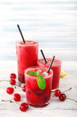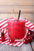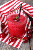 Zbliżenie wiśnia granita w okulary, na tle drewniane kolor