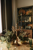 Kuchnia rustykalna, serwująca drewniany stół i zielone kieliszki vintage ze świecami