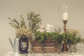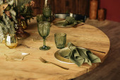 Kuchnia rustykalna, serwująca drewniany stół i zielone kieliszki vintage ze świecami