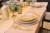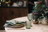Zdjęcie "Kuchnia rustykalna, serwująca drewniany stół i zielone kieliszki vintage ze świecami" może być wykorzystywane do celów osobistych i komercyjnych zgodnie z warunkami zakupionej licencji Royalty-free. Obraz jest dostępny do pobrania w jakości wysokiej rozdzielczości do 5760x3840.