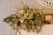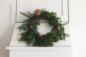 Świąteczny wieniec wykonany ze świerku na jasnym tle