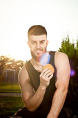 młody Latynos człowiek jedzenie banan owoce biegacz fitness portret format sportowy trening outdoor