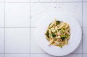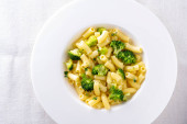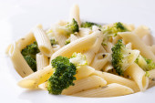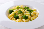 makaron z brokułami na białym talerzu i drewnianym stole.