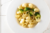 makaron z brokułami na białym talerzu i białym ceramicznym tle