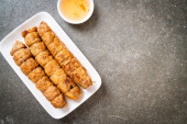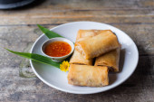 Zdjęcie "Chrupiące złote sajgonki na drewnianej desce z zieloną cebulą i sosem zanurzeniowym." może być wykorzystywane do celów osobistych i komercyjnych zgodnie z warunkami zakupionej licencji Royalty-free. Obraz jest dostępny do pobrania w jakości wysokiej rozdzielczości do 5760x3840.