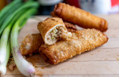 Chrupiące złote sajgonki na drewnianej desce z zieloną cebulą i sosem zanurzeniowym.