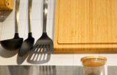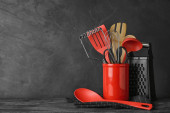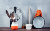 Zestaw różnych przyborów kuchennych na szarym blat w kuchni. Miejsce na tekst