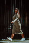 piękna kręcone włosy dziewczyna w ciasno zielony strój stanowi w drogim studio dla reklamy włosów