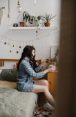 słodkie brunetka dziewczyna w a żółty bluza z a suszarka do włosów stanowi śmiech dla a salon piękności reklama