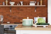 Sos patelnia z kolbą kukurydzy na drewnianym stole w kuchni