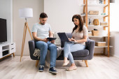 Zdjęcie "Młody mężczyzna rezerwuje pokój hotelowy online, podczas gdy jego żona czyta magazyn w domu" może być wykorzystywane do celów osobistych i komercyjnych zgodnie z warunkami zakupionej licencji Royalty-free. Obraz jest dostępny do pobrania w jakości wysokiej rozdzielczości do 5760x3840.