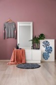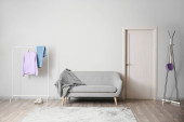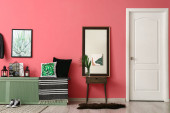 Wnętrze stylowej sali z lampą, stołem i czerwoną pufą