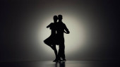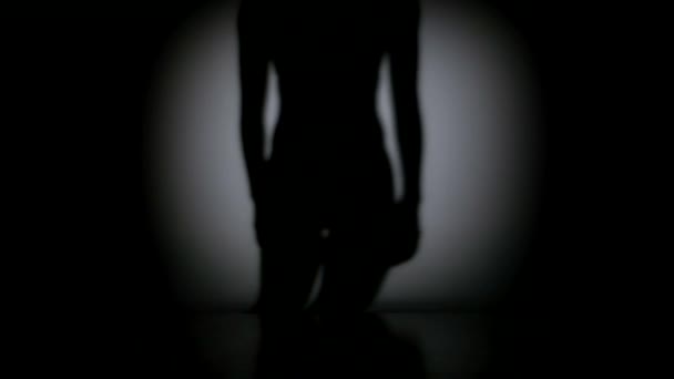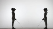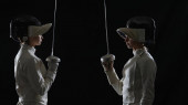 Czarne sylwetki dwóch żeńskich szermierzy walczących w pojedynku. Sportowcy krzyżują gwałcicieli i zadają ciosy. Dziewczyny pozują w ciemnym studiu na białym tle w punkcie reflektorów. Zwolniony ruch.