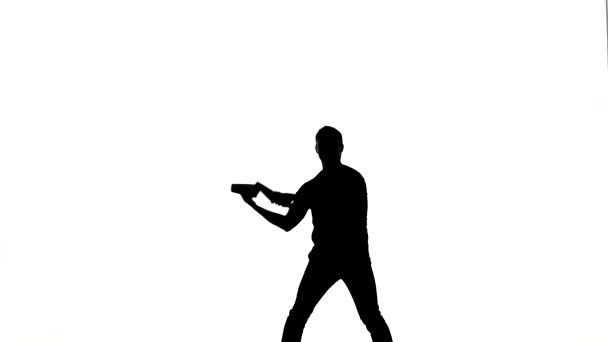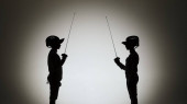 Czarne sylwetki dwóch żeńskich szermierzy walczących w pojedynku. Sportowcy krzyżują gwałcicieli i zadają ciosy. Dziewczyny pozują w ciemnym studiu na białym tle w punkcie reflektorów. Zwolniony ruch.