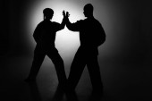 Zdjęcie "Czarne sylwetki dwóch żeńskich szermierzy walczących w pojedynku. Sportowcy krzyżują gwałcicieli i zadają ciosy. Dziewczyny pozują w ciemnym studiu na białym tle w punkcie reflektorów. Zwolniony ruch." może być wykorzystywane do celów osobistych i komercyjnych zgodnie z warunkami zakupionej licencji Royalty-free. Obraz jest dostępny do pobrania w jakości wysokiej rozdzielczości do 5760x3840.