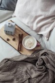Taca ze smacznym śniadaniem i wazon z kwiatami na wygodnym łóżku