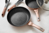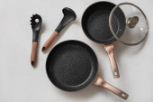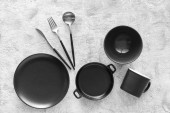 Zestaw różnych naczyń kuchennych na szarym drewnianym tle