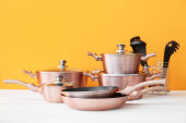Zestaw naczyń kuchennych i różnych składników na drewnianym stole przy lekkiej ścianie
