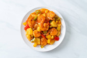 Mieszać smażony sos słodko-kwaśny z wieprzowiną i warzywami