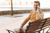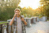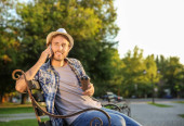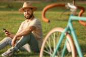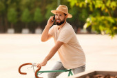 Przystojny brodaty mężczyzna z rowerem rozmawiający przez telefon komórkowy na zewnątrz