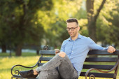 Przystojny brodaty mężczyzna za pomocą telefonu komórkowego w parku