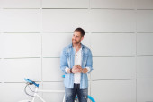 Stylowy brodaty mężczyzna z rowerem rozmawiający przez telefon komórkowy w mieście
