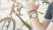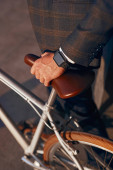 Stylowy młodzieniec z rowerem w mieście, zbliżenie