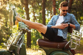Stylowy brodaty mężczyzna z rowerem przy użyciu telefonu komórkowego w mieście