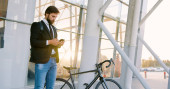 Stylowy brodaty mężczyzna z telefonem komórkowym, filiżanką kawy i rowerem w mieście