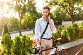 Młody brodaty mężczyzna z rowerem rozmawiający przez telefon komórkowy na nasypie