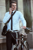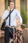 Młody brodaty biznesmen z rowerem rozmawiający przez telefon komórkowy w parku