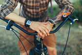 Młody biznesmen z rowerem na ulicy miejskiej, zbliżenie