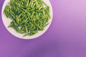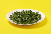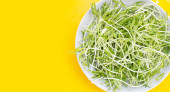 Widok górny mikrozieleni kiełki słonecznika w białym talerzu na żółtym tle, puste miejsce po prawej stronie. Wegetariańskie jedzenie. Surowe kiełki. Koncepcja zdrowego odżywiania.