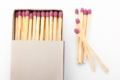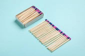Pudełko z różnymi nowymi zapałkami na niebieskim tle