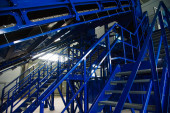Nowoczesne metalowe schody niebieskiego budynku na zewnątrz
